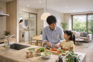 これは「分かち合い」を意味する言葉で、共働き世帯が多い現代において、家事を家族全員でシェアしやすい設計を指しています。