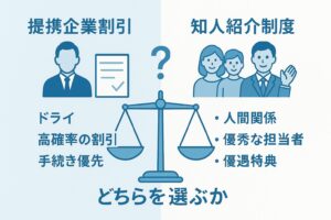 これから検討する方にとって悩ましいのが、「提携企業割引」と「知人紹介制度」は基本的に併用できないという点です(一部例外やキャンペーンを除く)。