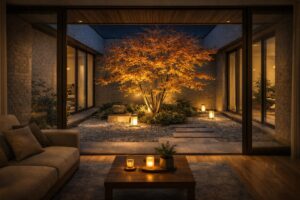 中庭は、外にいながらにして室内のような安心感がある特別な場所です。夜にライトアップされた植栽を眺める時間は、一人暮らしの平屋における醍醐味と言えます。